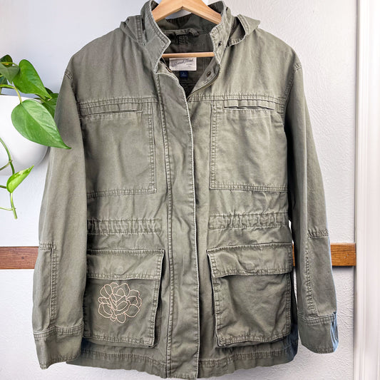 Military Green Parka with Hand Embroidered Peony